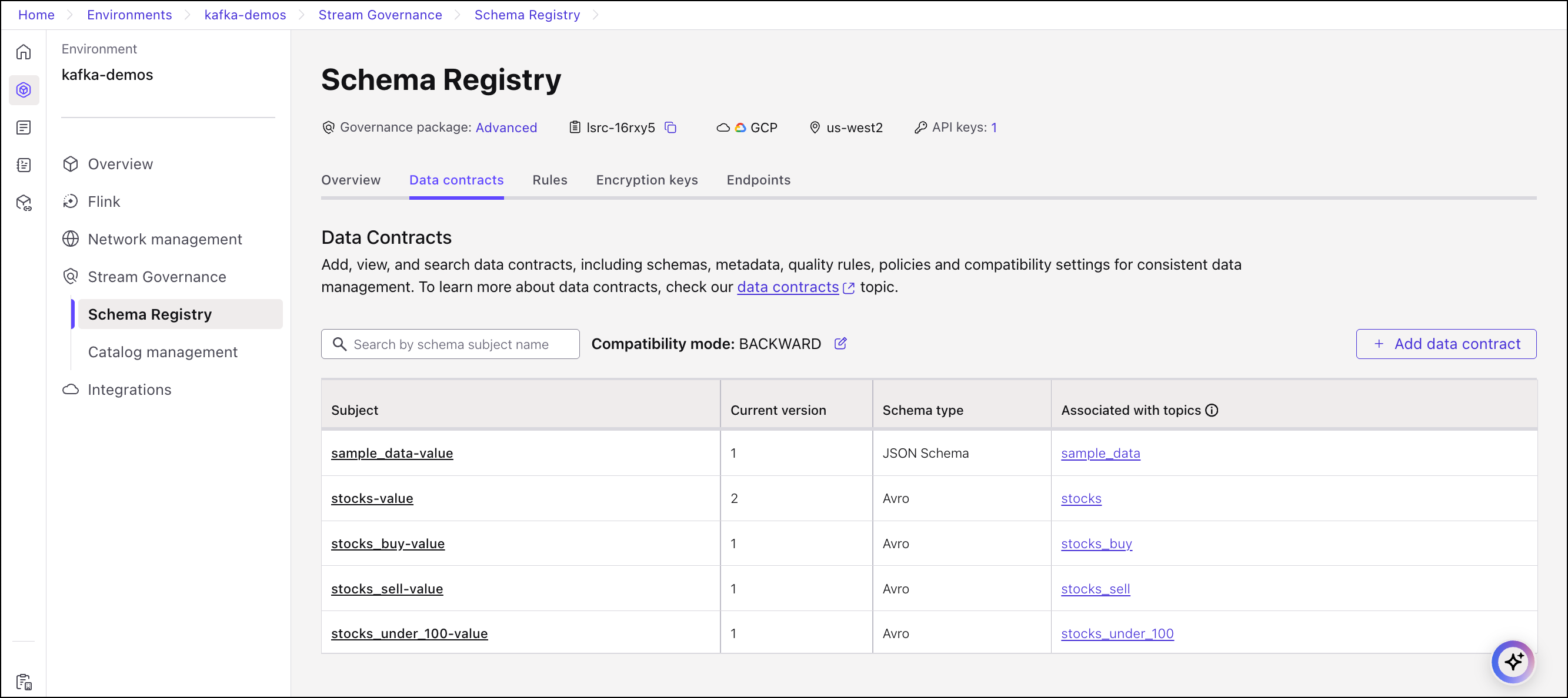 Click Schema Registry on the left panel, and then the Data contracts tab, to get a list of all schemas (data contracts) in the environment.