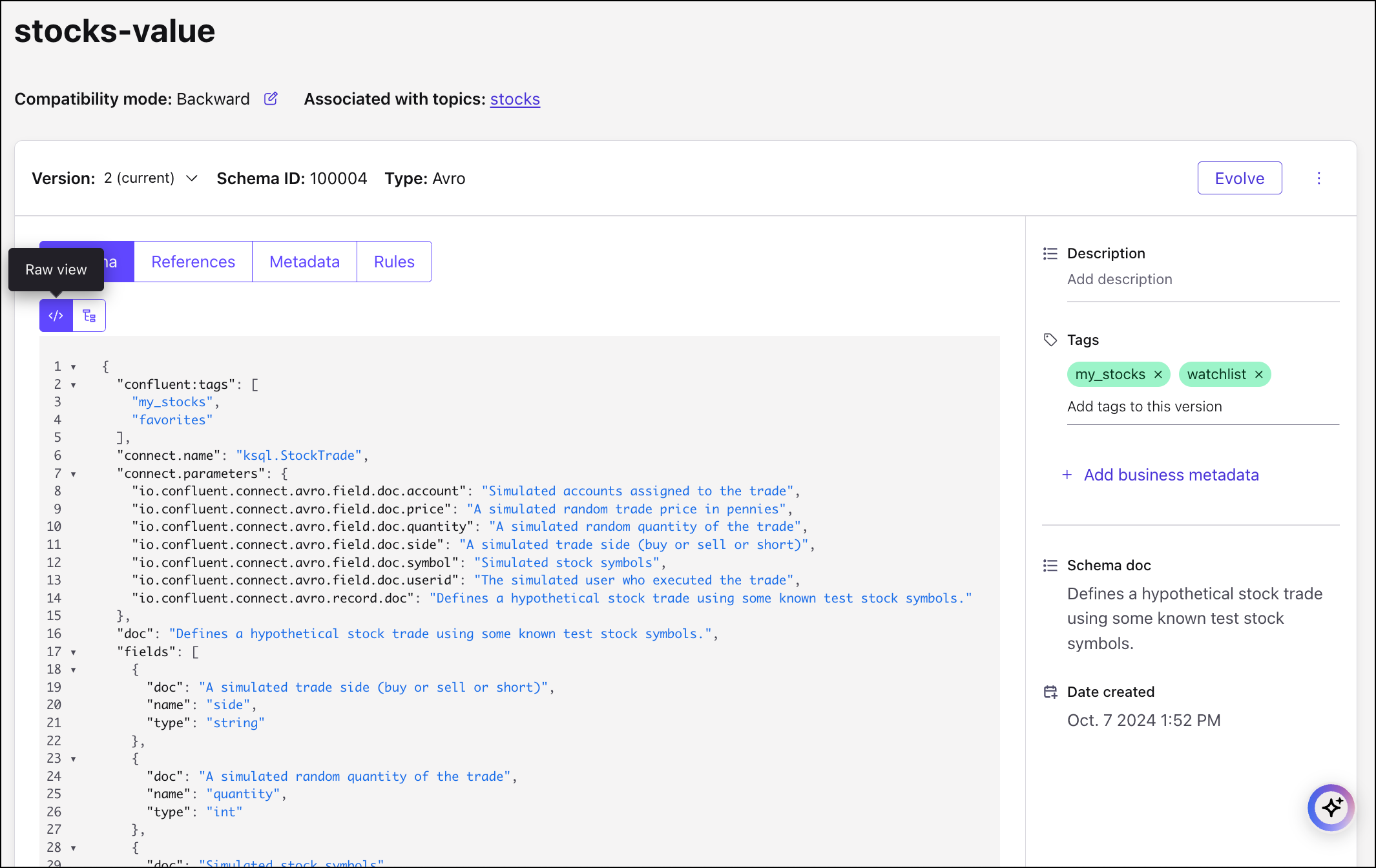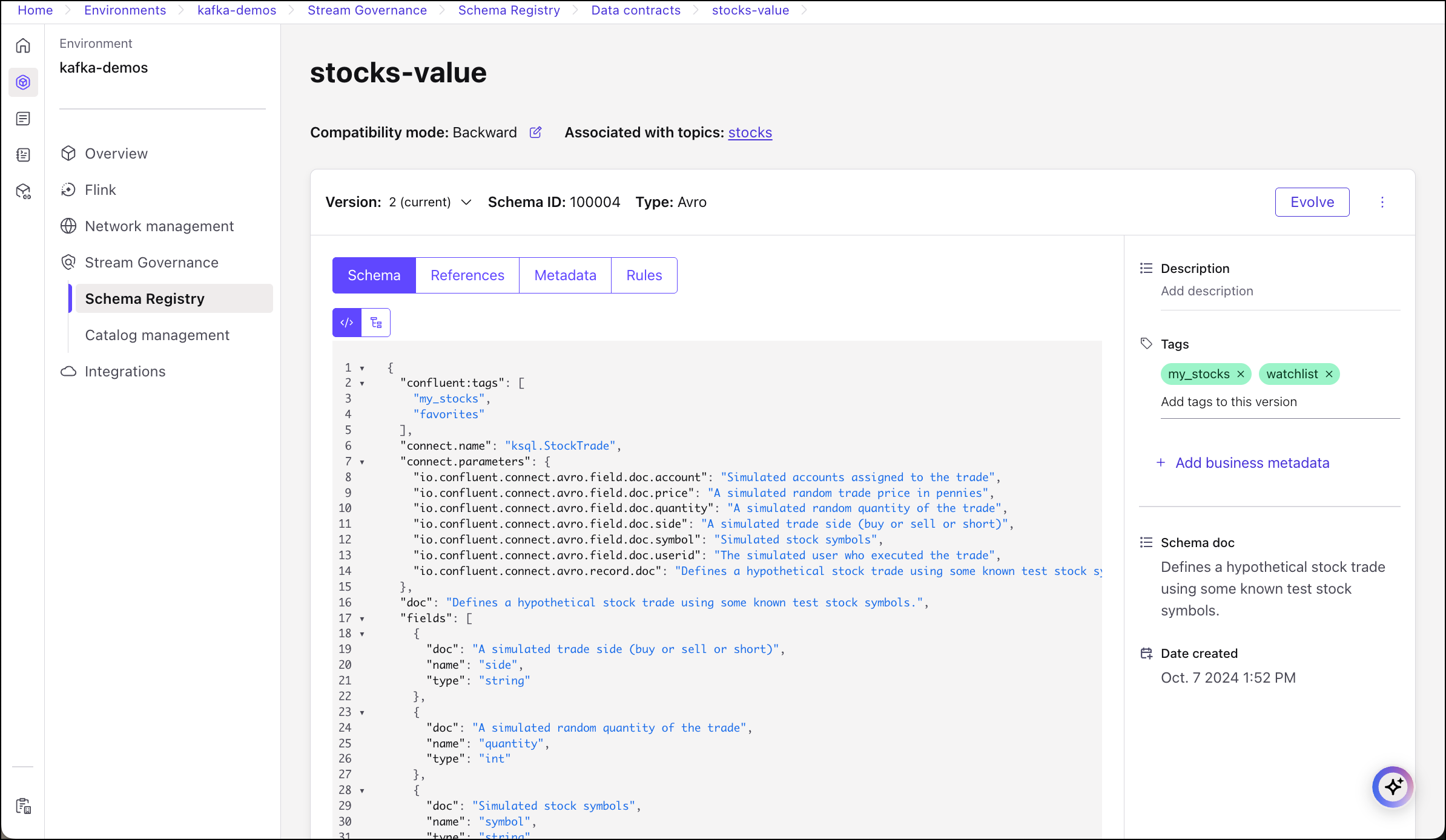 Confluent Cloud provides the ability to tag schema versions and fields within schemas as a means of organizing and cataloging data based on both custom and commonly used tag names. To learn about tagging, see Tag entities, data, and schemas in Data Discovery.