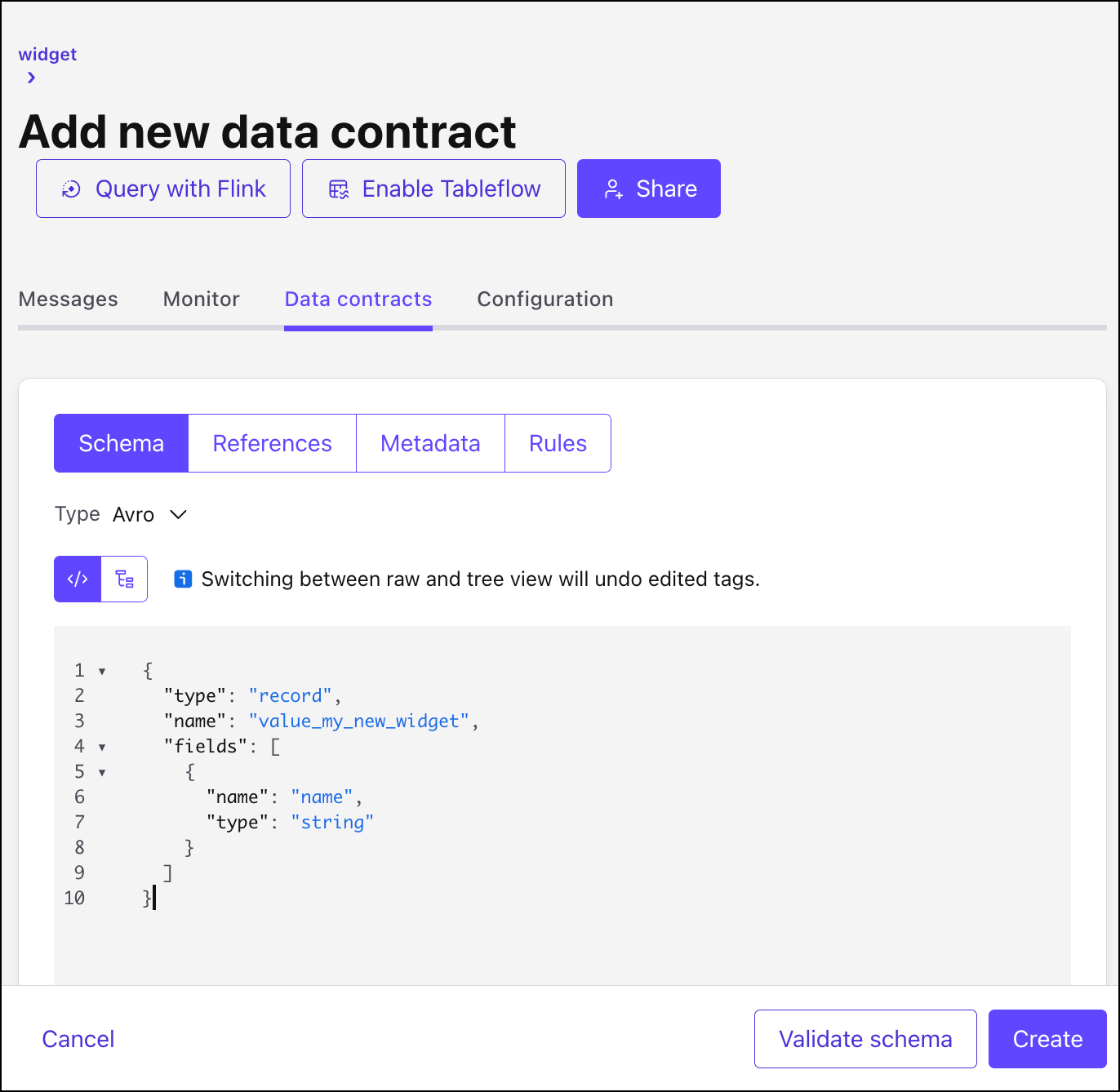 { "type": "record", "name": "value_my_new_widget", "fields": [ { "name": "name", "type": "string" } ] }