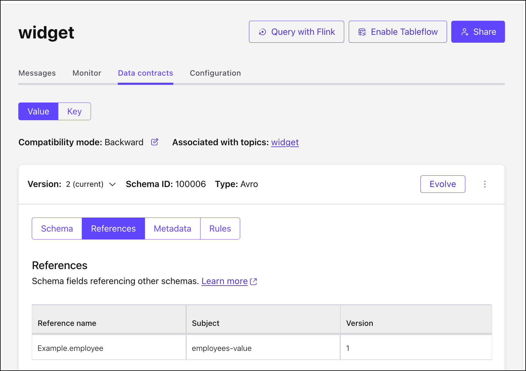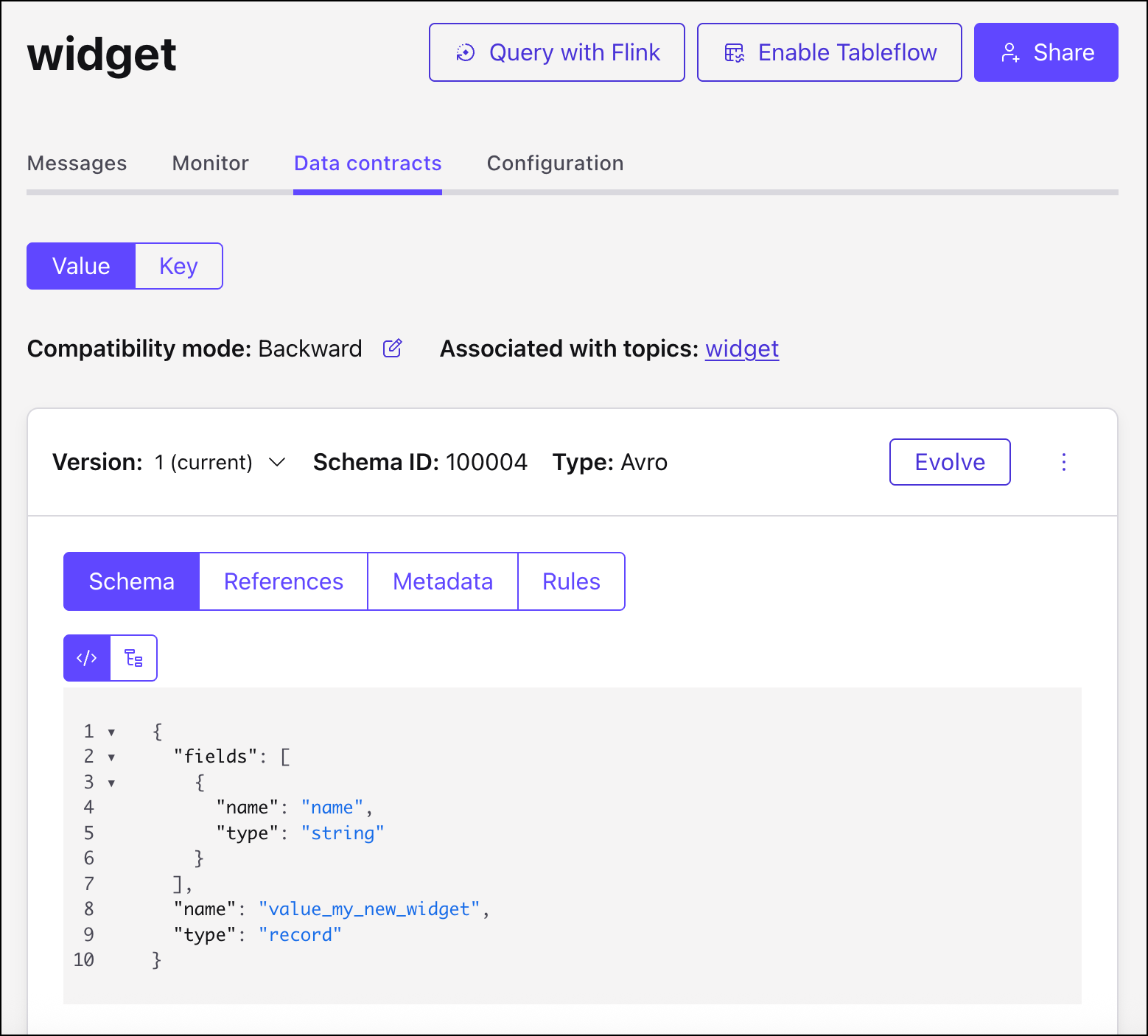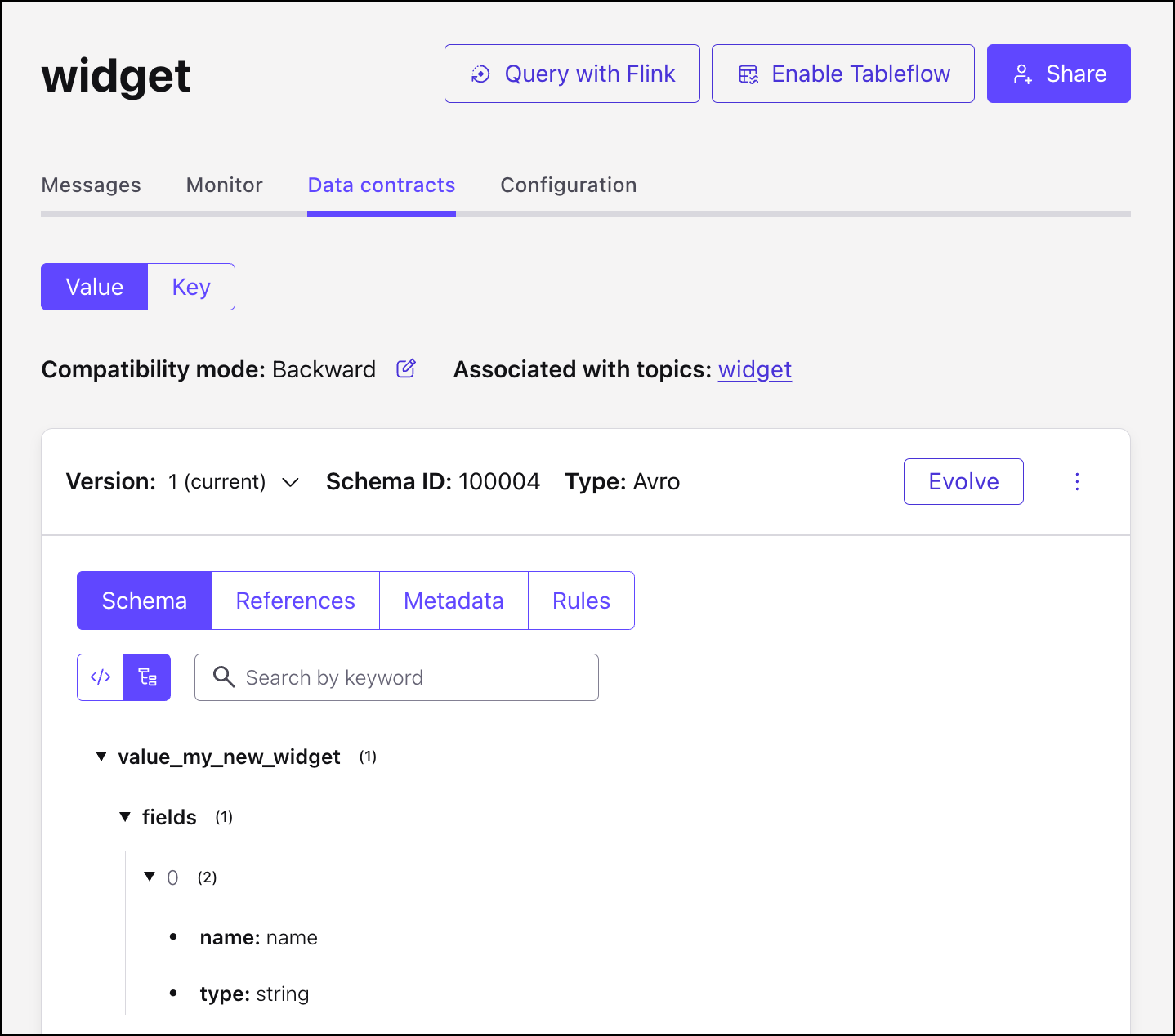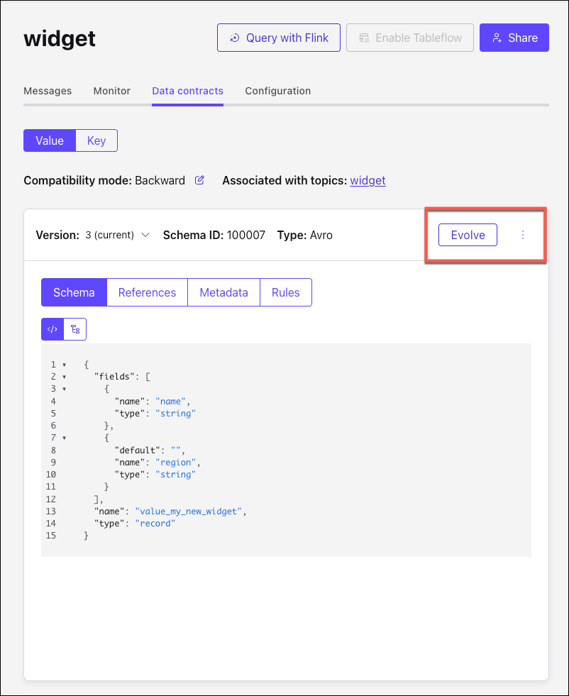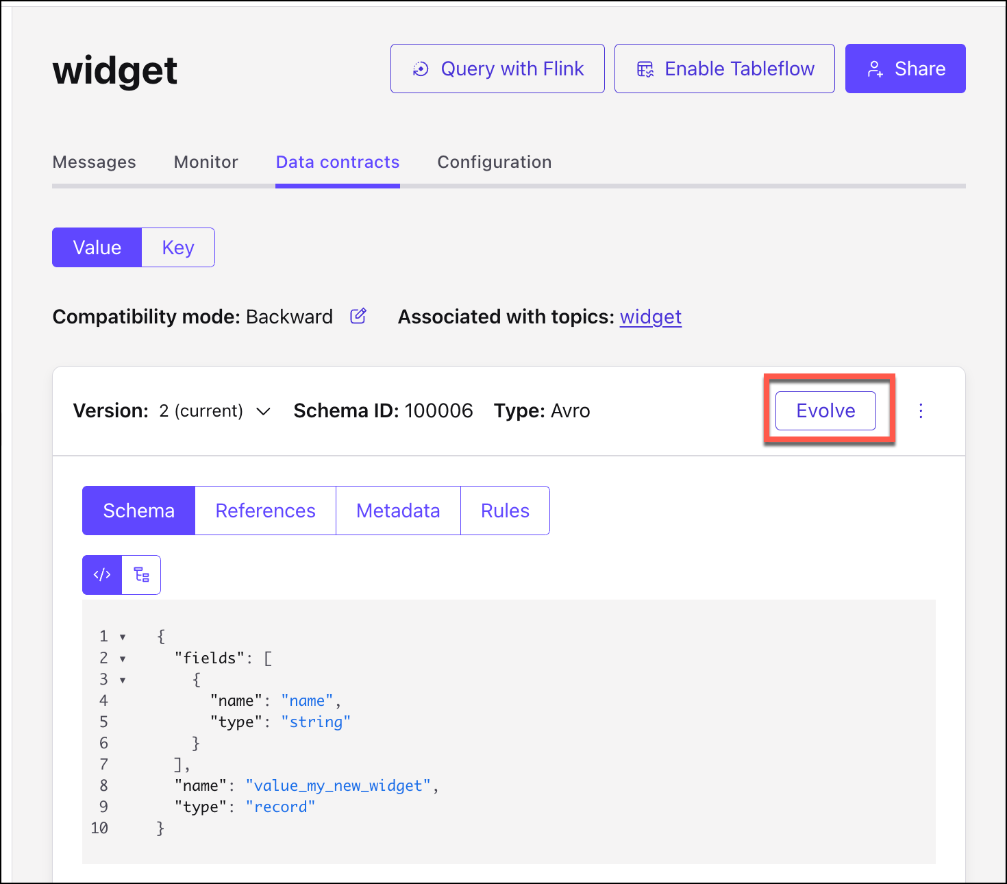 Then, navigate to the schema to which you want to add the reference. For example, to add a reference to the “widget-value” schema, navigate to the widget topic, click the Data contracts tab, click Evolve, and follow the steps below.