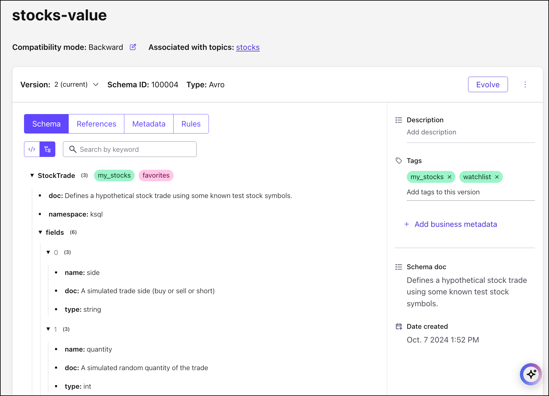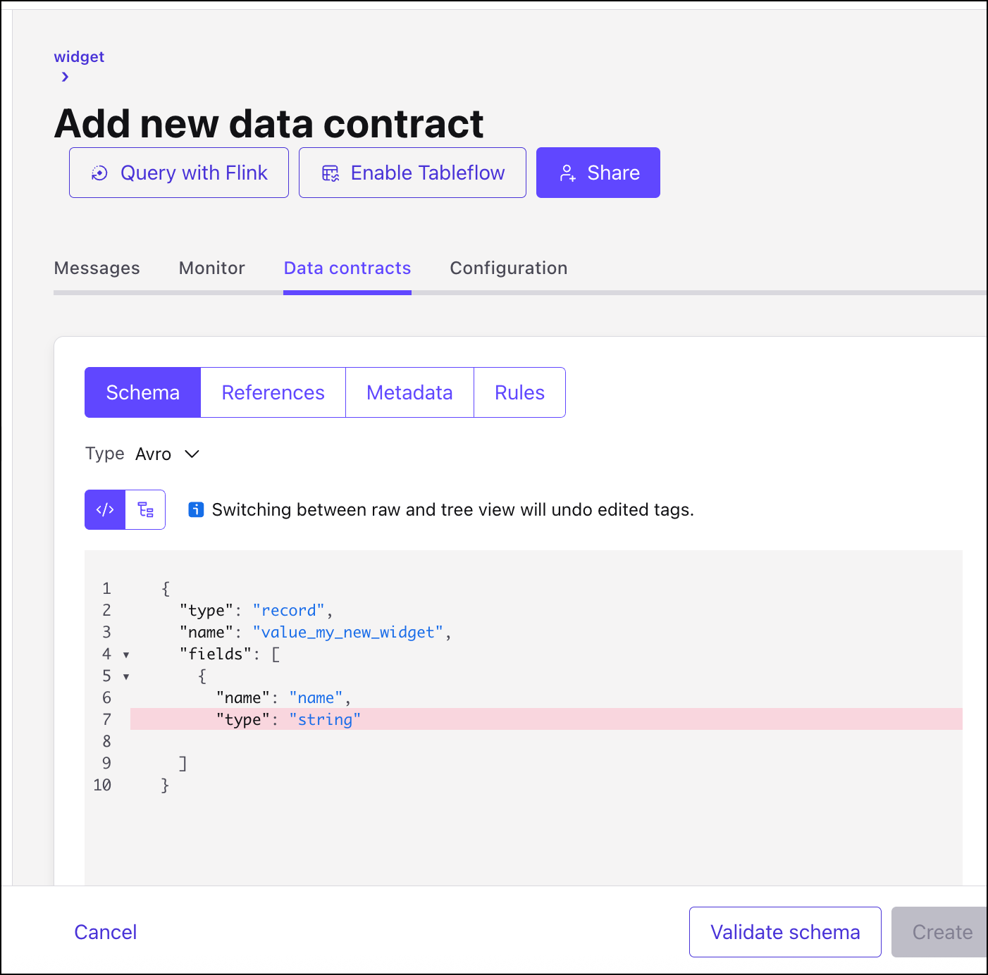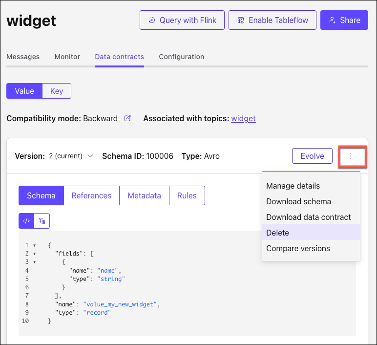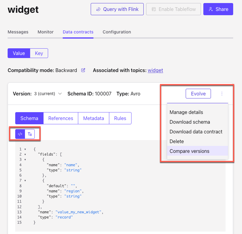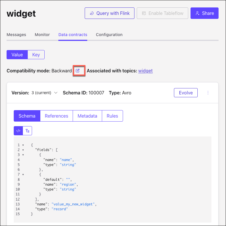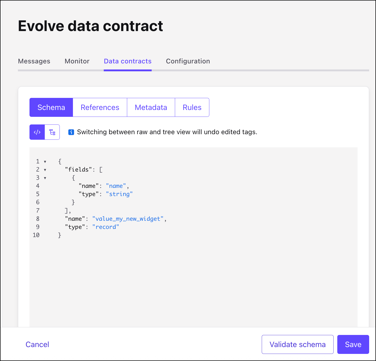 Then, navigate to the schema to which you want to add the reference. For example, to add a reference to the “widget-value” schema, navigate to the widget topic, click the Data contracts tab, click Evolve, and follow the steps below.