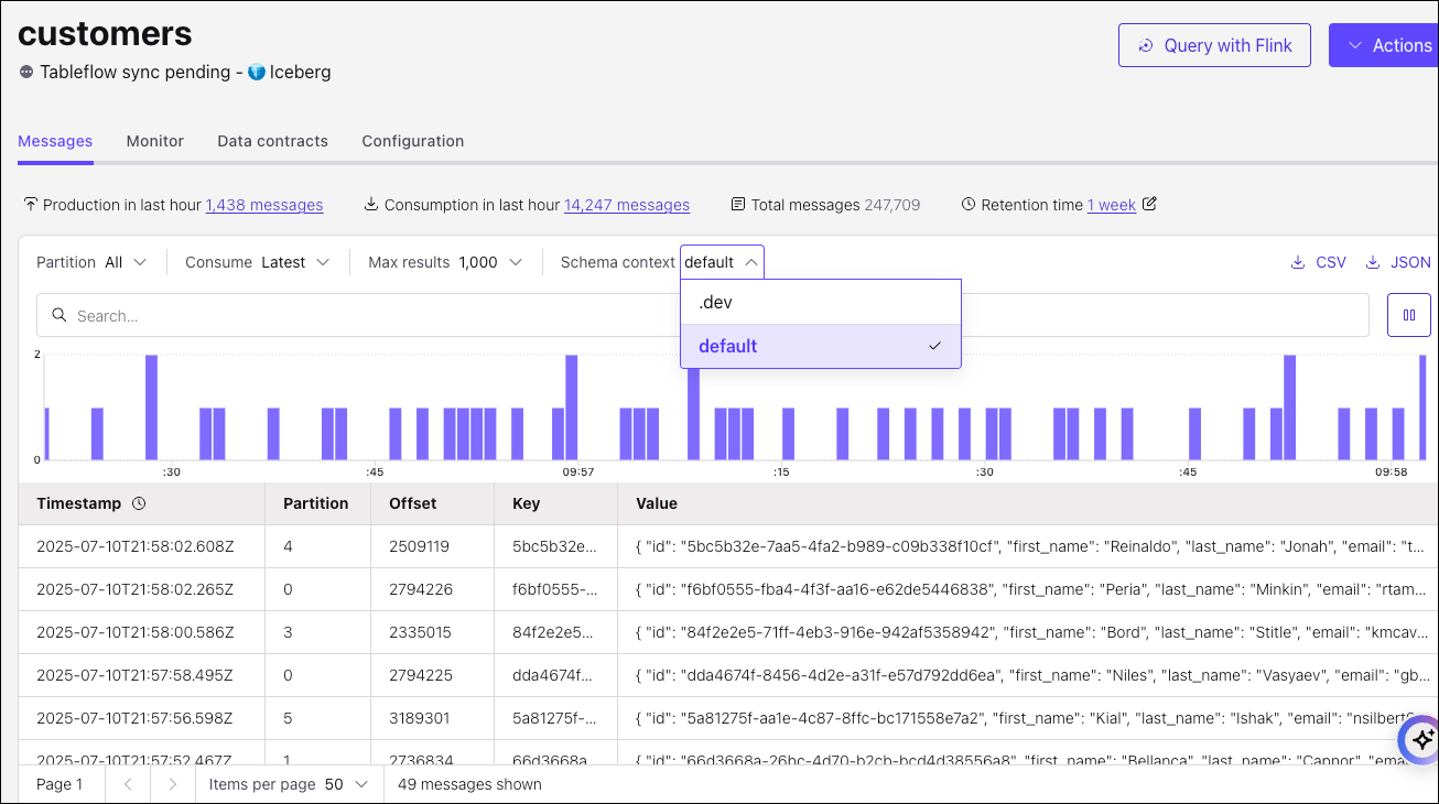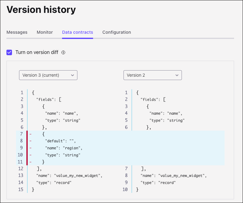 namefield) and new messages constructed per the Version 2 schema (withnameandregionfields). For messages that match the Version 1 schema and only have values forname,regionis left empty. To learn more, see Passing compatibility checks in the Confluent Cloud Schema Registry Tutorial Tutorial.Click Save.