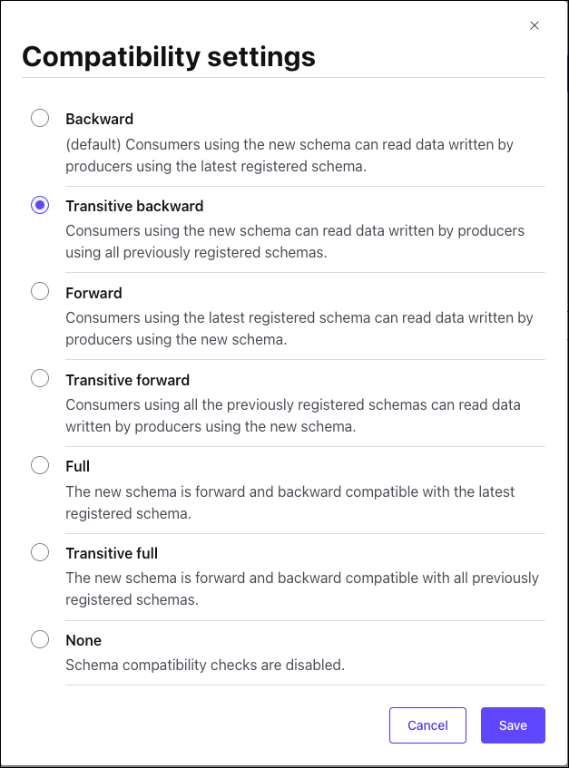 Descriptions indicate the compatibility behavior for each option. For more information, including the changes allowed for each option, see Schema Evolution and Compatibility.