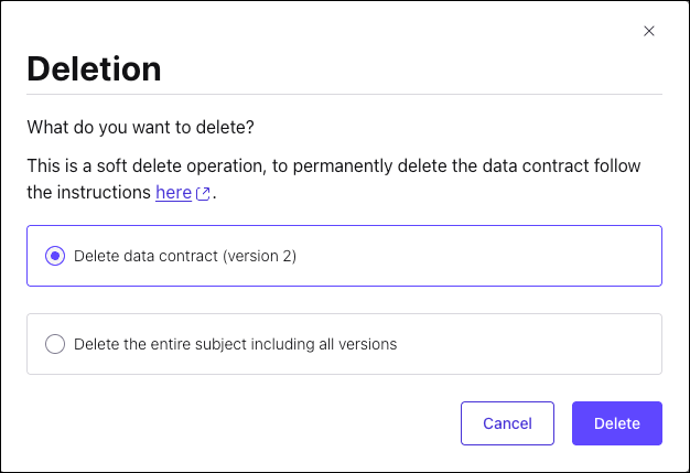 On the dialog, select whether to delete only a particular version of the schema or the entire subject (all versions).