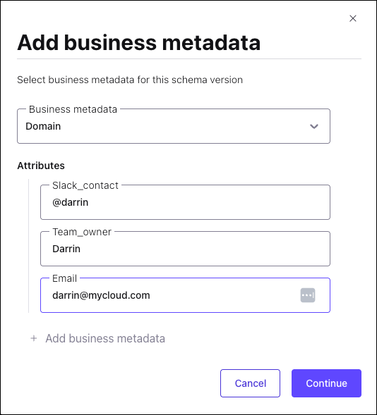 When you have added all of the business metadata labels and attributes desired, click Continue to apply them to selected schema version.