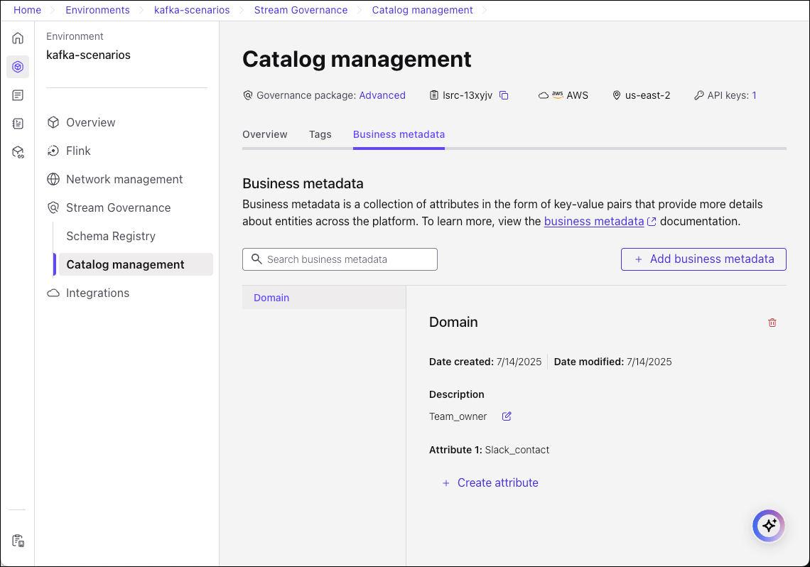 You can create and apply business metadata through the Confluent Cloud Console as described in the sections below or through the Confluent Cloud REST API, as described in Business metadata API examples.