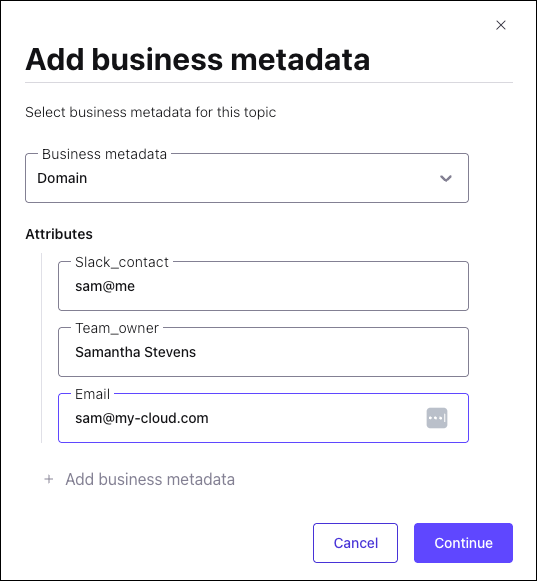 - On this dialog, you have the option to apply multiple labels (business metadata) to this same topic by clicking + Add business metadata at the bottom of the dialog.