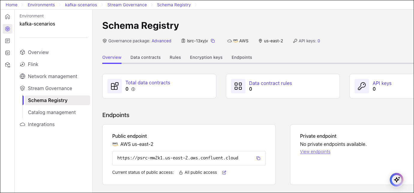 The Schema Registry settings and information will be available on the Schema Registry tab for the environment.