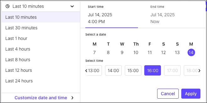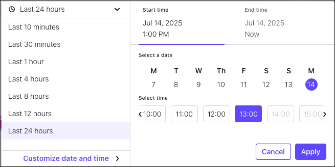 The graphs, nodes, and available data will change depending on the selected time window. For example, a custom setting to show data only from last Friday from 6:00-7:00 AM will not show streams created later in the week. Similarly, the graph search is dependent on the time window setting, and will not find data that isn’t available in the current time window.