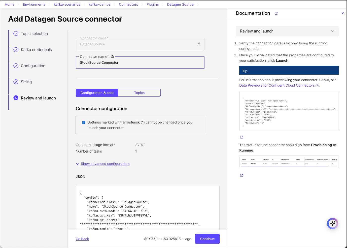 You have added the Connect Datagen source connector to generate sample data. The connector will use AVRO as the output record format, and start sending data to your target topic,