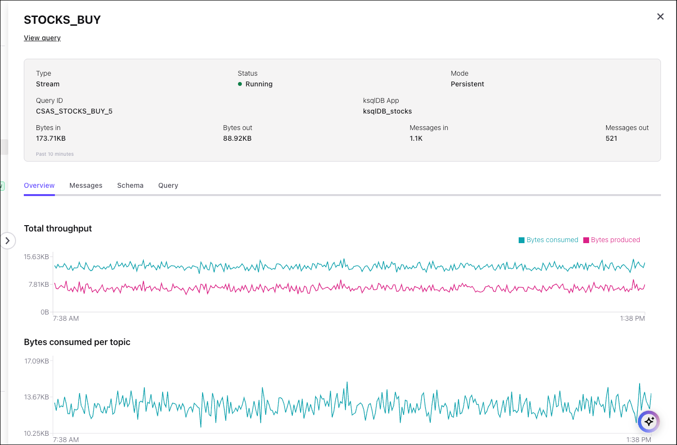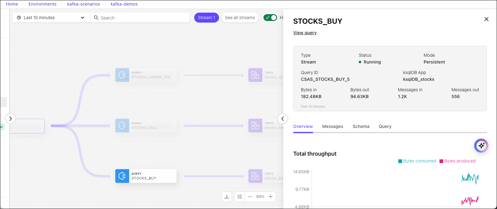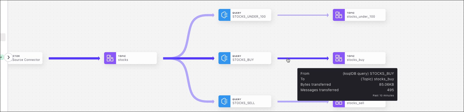 stockstopic, then create a persistent stream that filters on stocks with price <= 100. This feed the results to thestocks_under_100topic.You’ll need to specify and run three separate queries for this step. You start by creating the