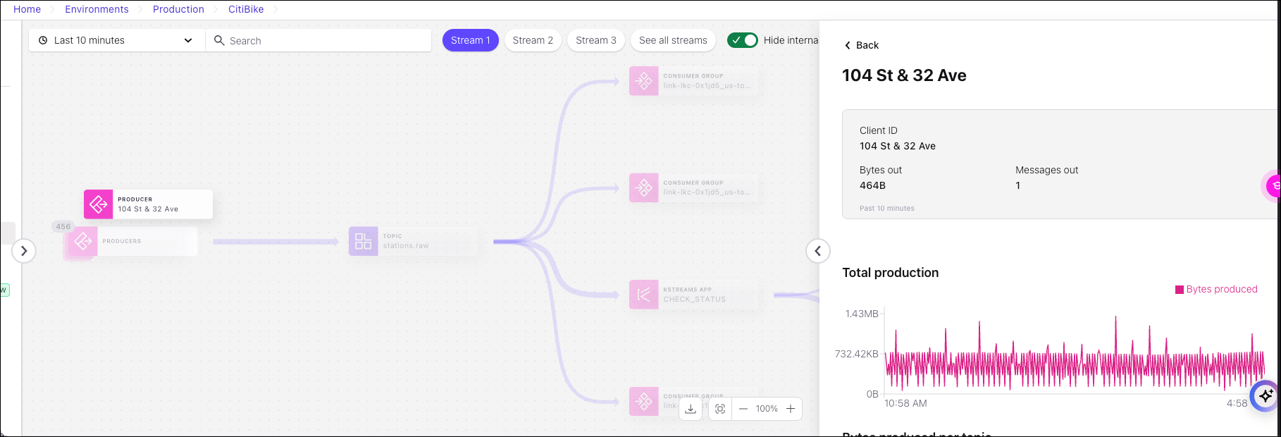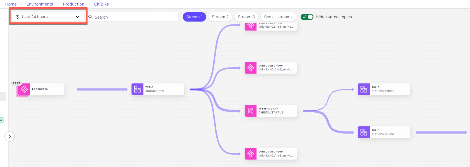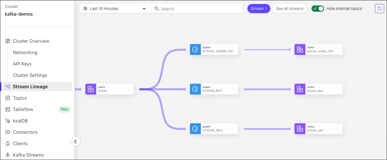 In order to really see Stream Lineage in action, you need to configure topics, producers, and consumers to create a data pipeline. Once you have events flowing into your pipeline, you can use Stream Lineage to inspect where data is coming from, what transformations are applied to it, and where it’s going.