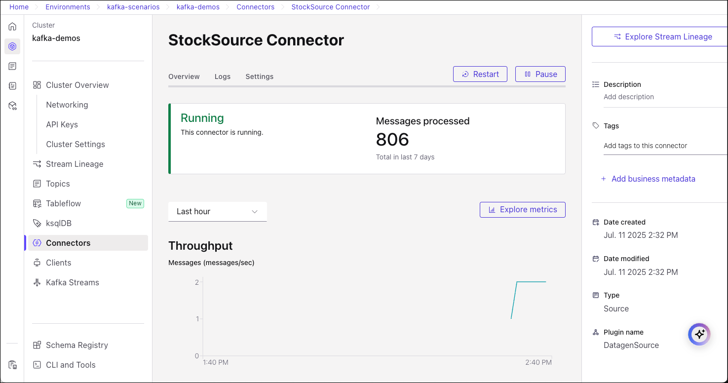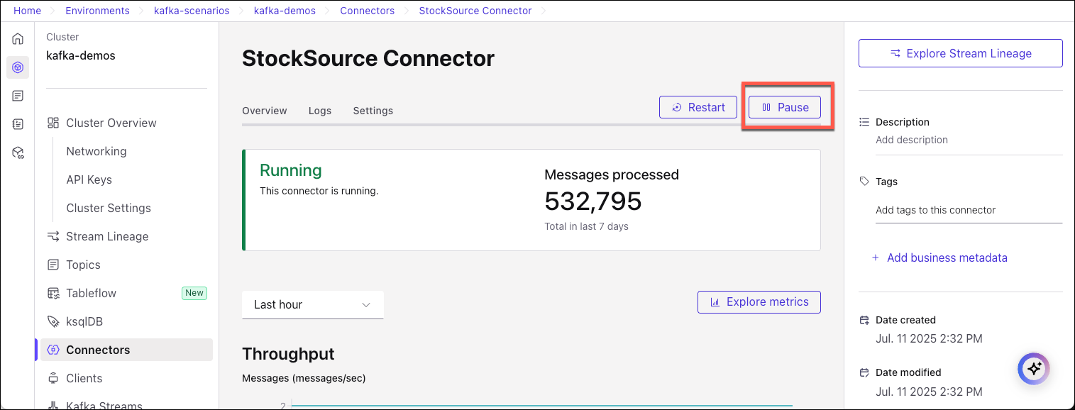 On the Confluent Cloud Console, navigate to the Datagen StockSource connector, click it to drill down, and pause the connector.