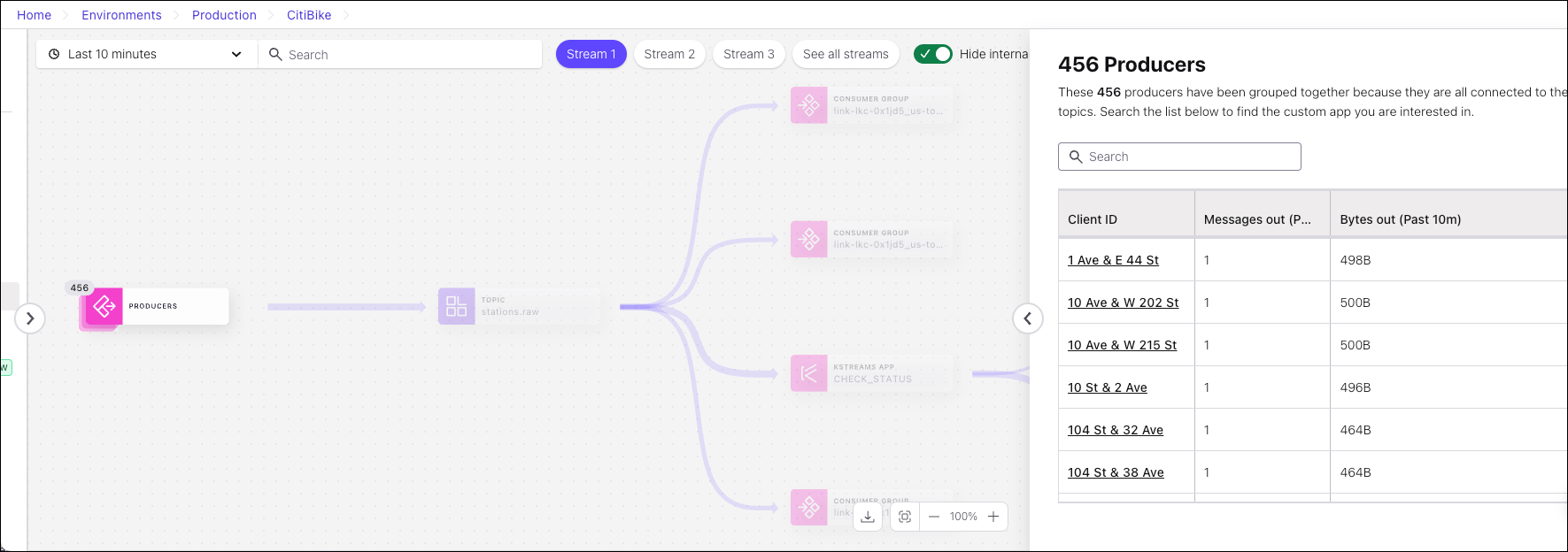 Consumers and producers are automatically grouped; that is, a group of consumers or producers is represented as a single node that expands upon drilldown to show the client IDs.