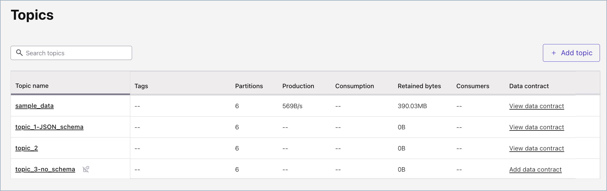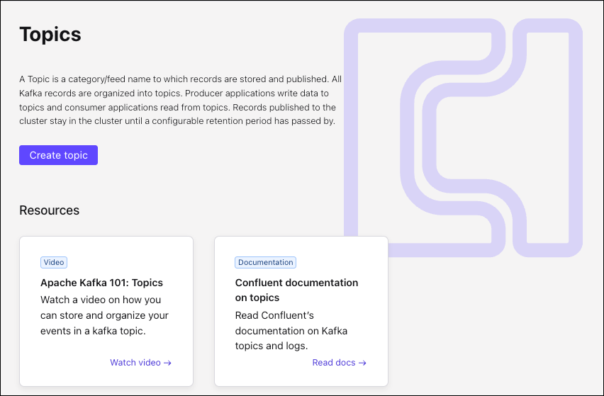 An Apache Kafka® topic is a category or feed that stores messages. Producers send messages and write data to topics, and consumers read messages from topics. Topics are grouped by cluster within environments.