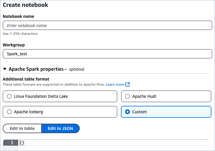 In the Apache Spark properties section, select Custom, which enables providing Spark properties in JSON format.