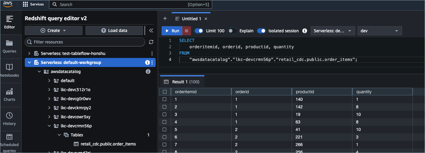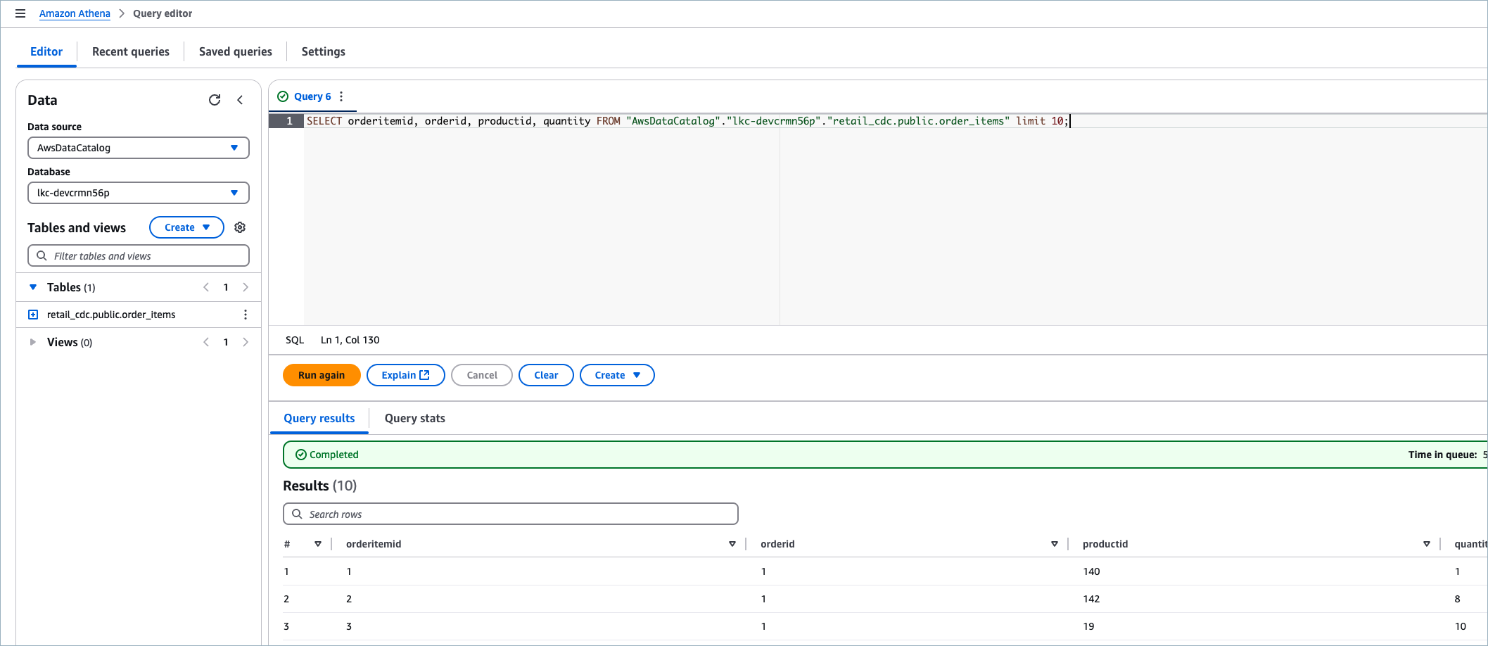SELECT orderitemid, orderid, productid, quantity FROM "AwsDataCatalog"."lkc-a1b2c3"."retail_cdc.public.order_items" LIMIT 10;