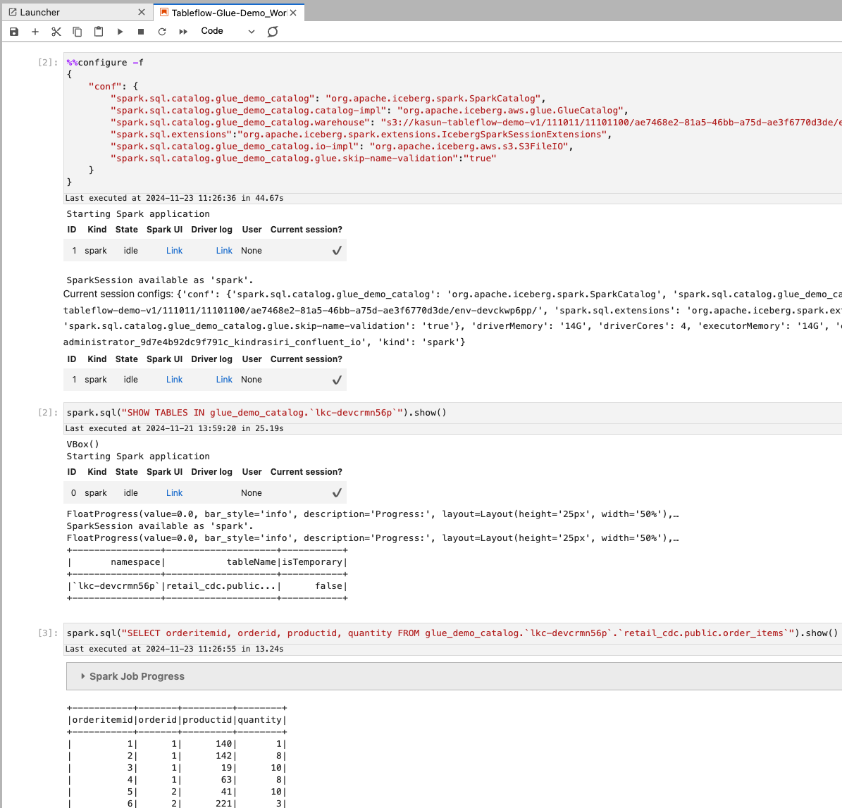 spark.sql("SHOW TABLES IN glue_demo_catalog.`lkc-devcrmn56p`").show() spark.sql("SELECT orderitemid, orderid, productid, quantity FROM glue_demo_catalog.`lkc-devcrmn56p`.`retail_cdc.public.order_items`").show()