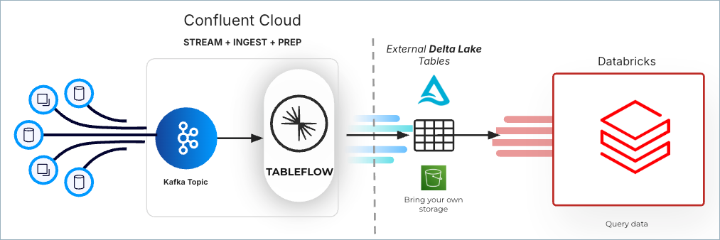 Confluent Tableflow enables you to expose Kafka topics as Delta Lake tables. Tableflow automatically materializes Kafka topics into Delta Lake tables in your cloud storage. These tables can be consumed as external read-only Delta tables from Databricks.